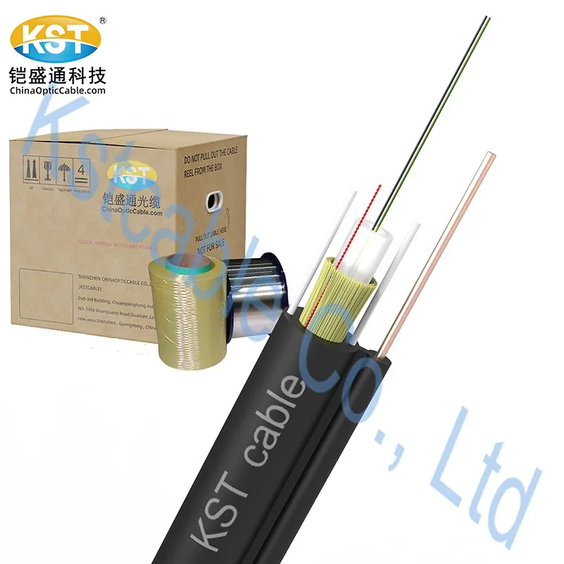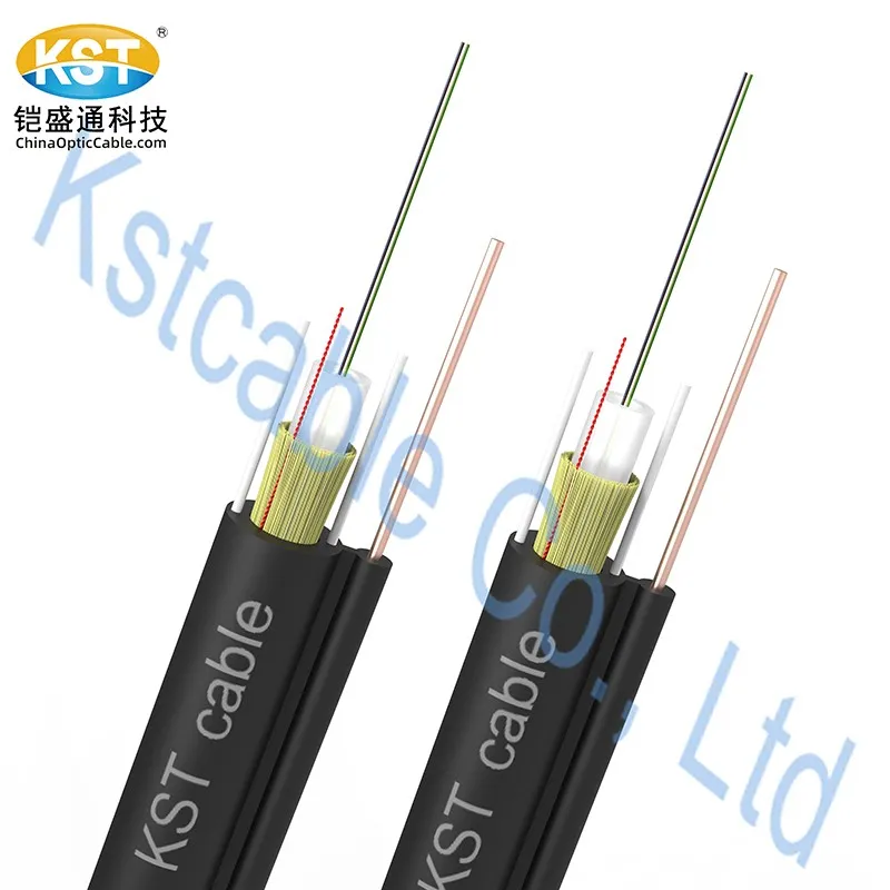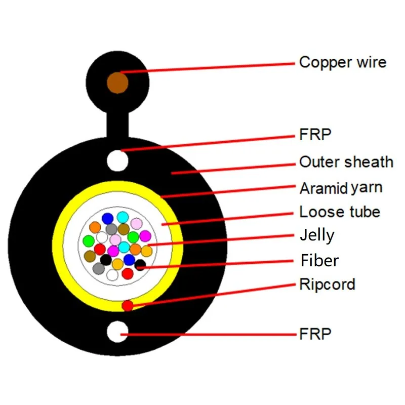 Figure 8 of the hybrid cable the suspension part is a 24AWG copper wire, and the optical cable part is jelly filled bundle tube, surrounded by aramid yarn reinforcing parts, and a layer of polyethylene (PE) or flame-retardant low smoke zero halogen polyolefin (LSZH) outer sheath is extruded on the outside.Two symmetrical FRP pieces are embedded inside the outer sheath.The maximum can reach 24 cores.